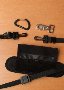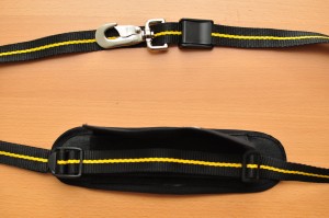 You might wonder why I have two sliding carabiners on the strap (one stays hidden inside the shoulder pad). Well, as you can see in the next picture, I designed my strap so that you can open it, slide the carabiners to the open ends and attach them to the camera again, in the way regular camera straps are used. If you think you don’t need this, you can omit some parts to make the connection inside the shoulder pad simpler.