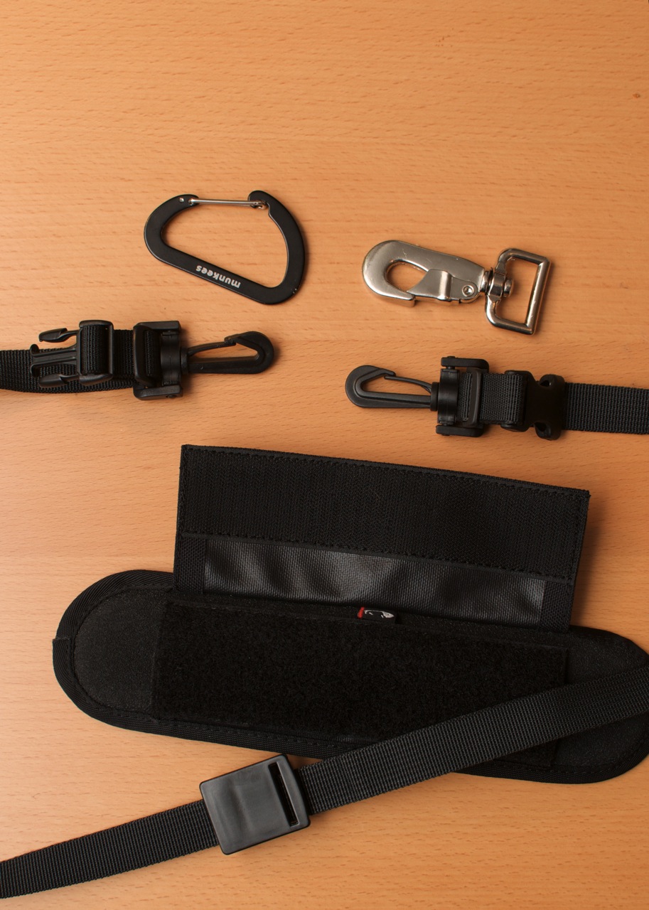 The big, shiny metal carabiner on the upper right is a replacement for the one from the camera bag. I stripped it from a dog leash (for big dogs!, 7€ at Fressnapf). Should I ever carry a 70-200/2.8, I’ll use that one, but for my current, lightweight equipment I prefer the plastic parts because they’re easier to open and weigh less.