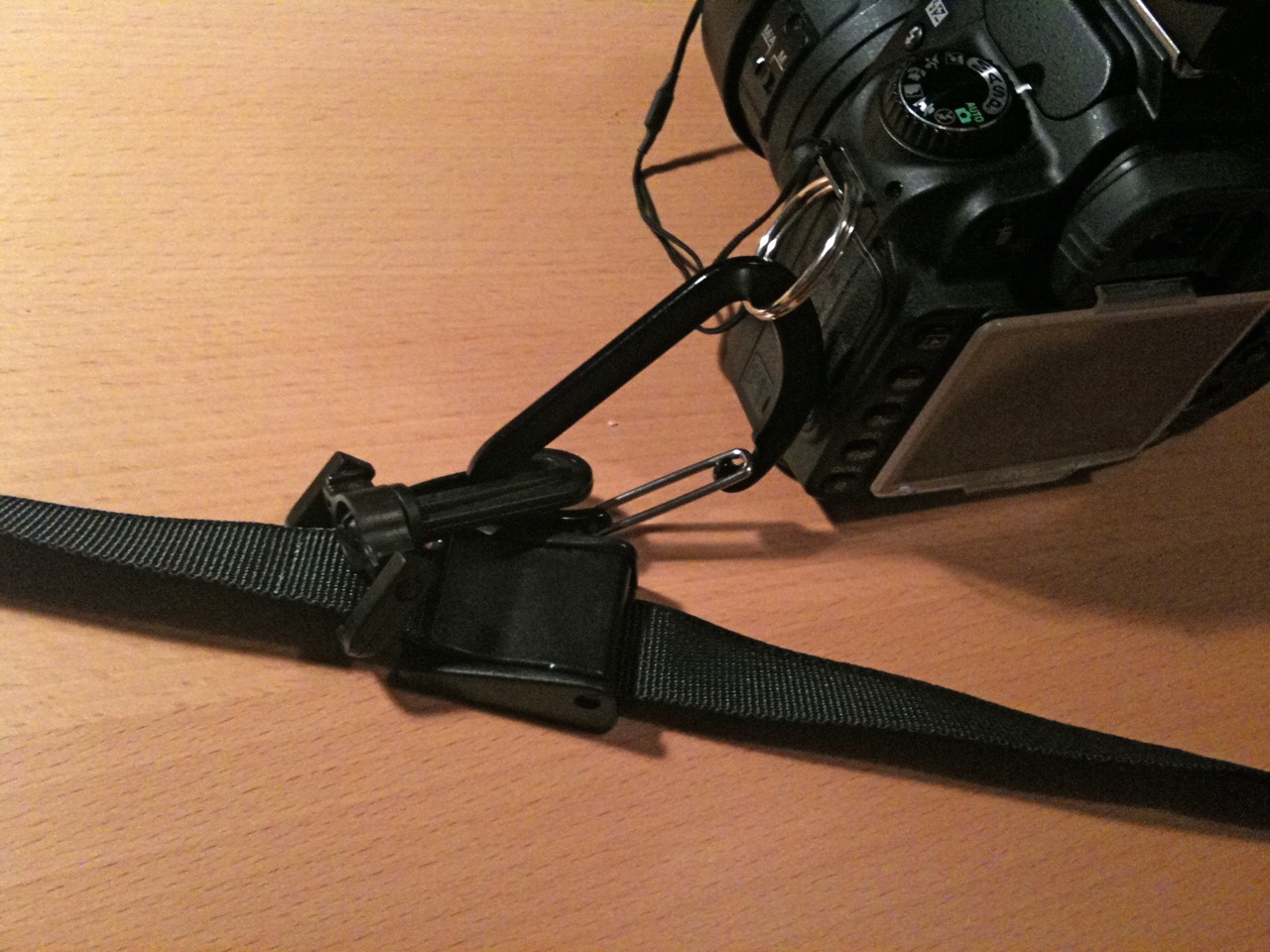 The last image shows how the strap is attached to my D90. I don’t trust the tripod mount and finding a matching screw is difficult as well. A simpler and better way to attach the camera to the strap is to use the dedicated strap eyes on the camera body. To be able to attach the carabiner and to make the system a bit more flexible, I added a simple key ring that remains on the camera.